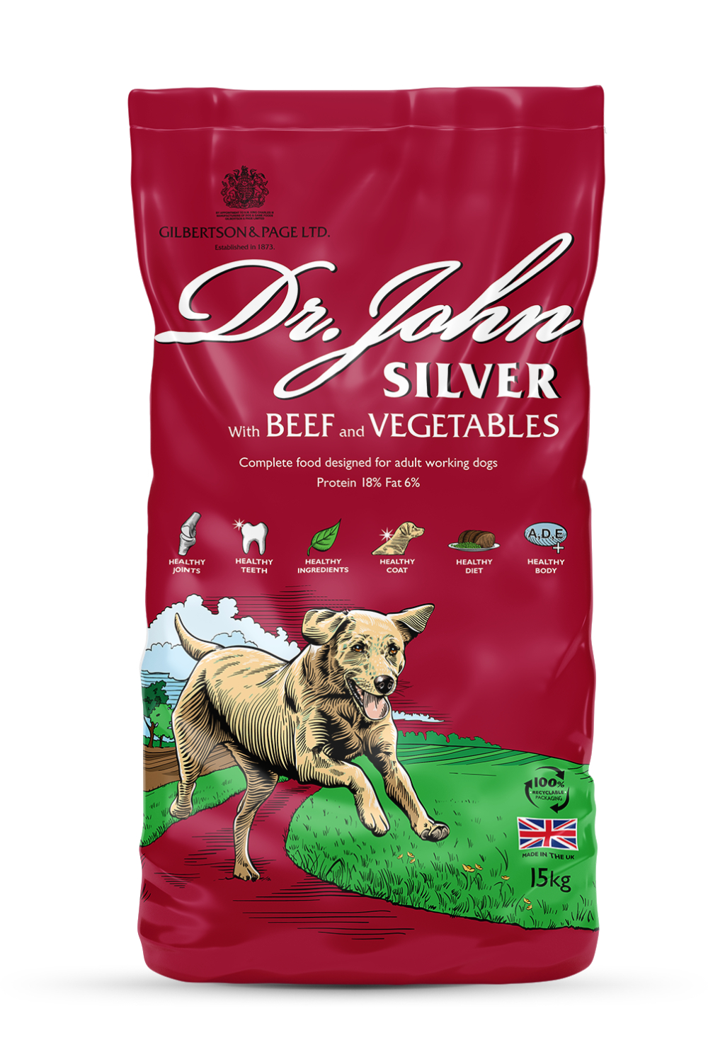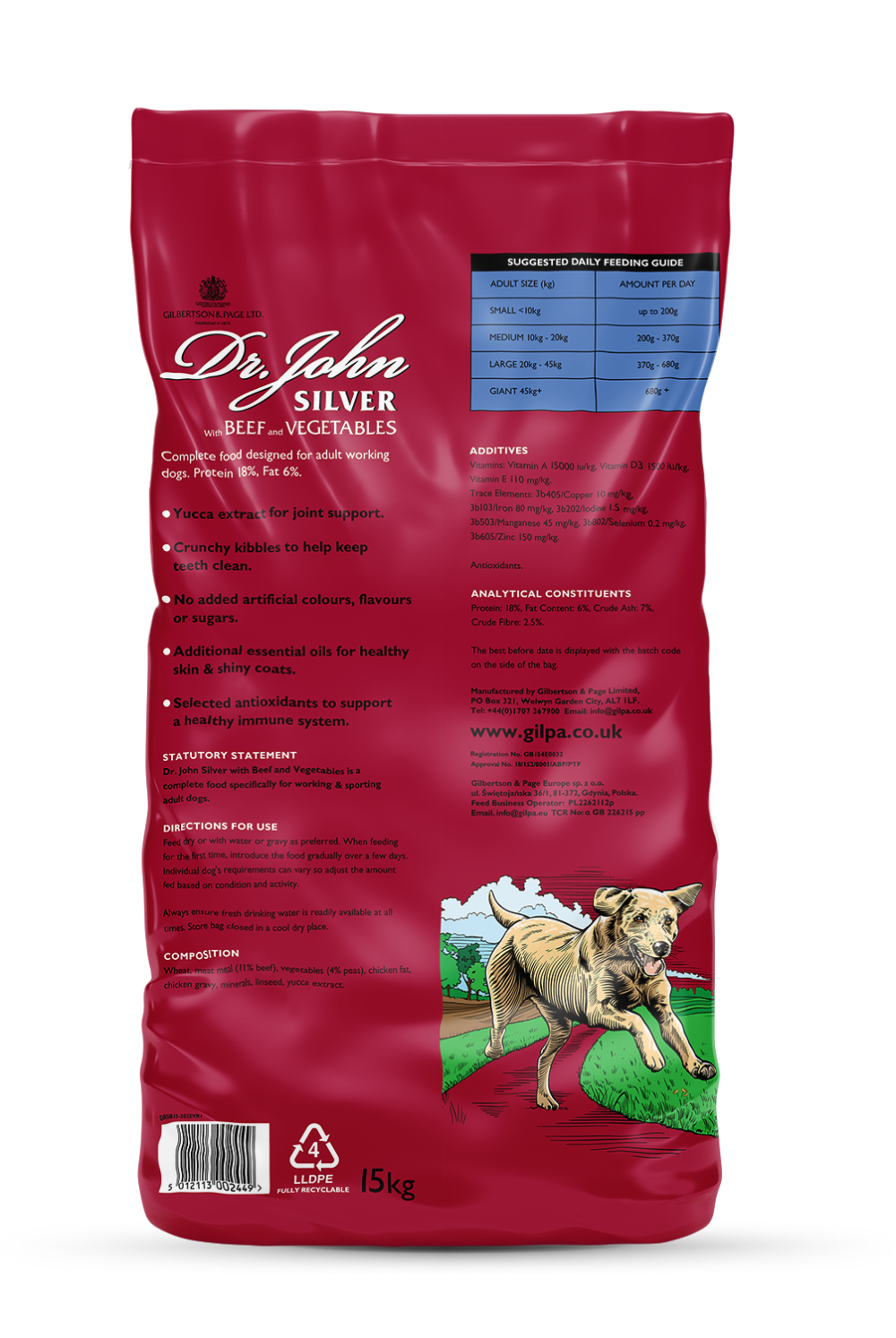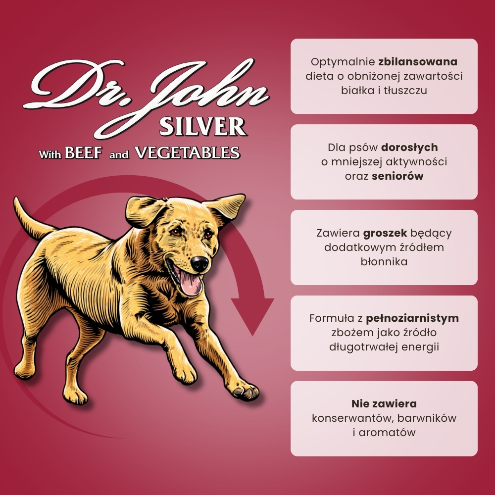 Dr John Silver Beef with Vegetables to kompletna receptura o obniżonej zawartości białka i tłuszczu, opracowana z myślą o mniej aktywnych dorosłych i starszych psach pracujących lub tych ze skłonnością do nadwagi. Oprócz niższego, ale zrównoważonego poziomu zdrowego białka z wołowiny, produkt zawiera pełnoziarnistą bazę. Zapewnia ona powolne uwalnianie węglowodanów, utrzymując stabilny poziom energii i dając czworonogowi satysfakcję z posiłku przez cały dzień. Chrupiące krokiety są produkowane z wysokiej jakości naturalnych składników i nie zawierają sztucznych barwników, aromatów ani cukrów.