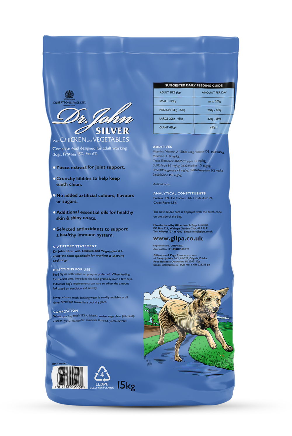 Dr John Silver Chicken with Vegetables to kompletna receptura o obniżonej zawartości białka i tłuszczu, opracowana z myślą o mniej aktywnych dorosłych i starszych psach pracujących lub tych ze skłonnością do nadwagi. Oprócz niższego, ale zrównoważonego poziomu zdrowego białka z kurczaka, produkt zawiera pełnoziarnistą bazę. Zapewnia ona powolne uwalnianie węglowodanów, utrzymując stabilny poziom energii i dając czworonogowi satysfakcję z posiłku przez cały dzień. Chrupiące krokiety są produkowane z wysokiej jakości naturalnych składników i nie zawierają sztucznych barwników, aromatów ani cukrów.