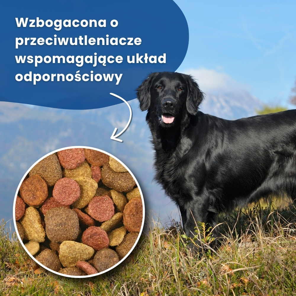 Skład: pszenica, mięso drobiowe (min. 15% mięsa z kurcząt), tłuszcz drobiowy, kukurydza, witaminy i minerały, siemię lniane (flax), ziemniaki (min. 4% w „pomarańczowych” kawałkach), ryż (min. 4% w „pomarańczowych” kawałkach), marchewka ( min. 4% w „pomarańczowych kawałkach), wyciąg z juki, zestaw ziół (900 mg/kg), wyciąg z małża nowozelandzkiego (100 mg/kg)