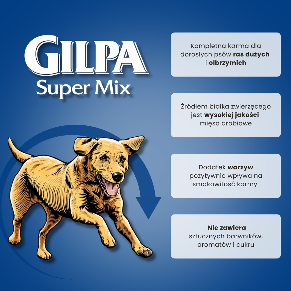 Gilpa Super Mix to doskonale zbilansowana, kompletna sucha karma dla dorosłych psów wszystkich ras. Starannie opracowana receptura zawiera pyszne mięso z kurczaka, ryż, marchewkę i ziemniaki. Zawiera 20% białka, 10% tłuszczu — bez sztucznych barwników, aromatów i cukrów. Wzbogacona o przeciwutleniacze wspomagające zdrowy układ odpornościowy oraz kwasy omega 3 i 6. Chrupiące krokiety wykonane z najlepszych składników pomagają utrzymać zęby w czystości.