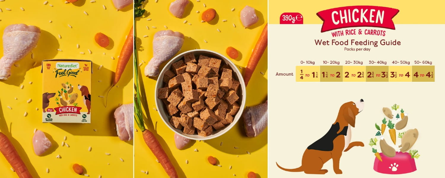 Naturediet Feel Good Chicken to smakowita mokra karma, delikatnie gotowana na parze. Receptura opiera się na na świeżo przygotowanym kurczaku z dodatkiem marchewki i ryżu. To pełnoporcjowy, zbilansowany posiłek stworzony wyłącznie z naturalnych, starannie dobranych składników odżywczych, które wspierają zdrowie, kondycję oraz wygląd Twojego pupila. Formuła jest mono proteinowa — jedynym źródłem białka zwierzęcego jest kurczak, co ułatwia żywienie psów wrażliwych i z alergiami pokarmowymi. Karmę można stosować u psów dorosłych i starszych, a także u szczeniąt powyżej 6. miesiąca życia. Sprawdzi się również u czworonogów wymagających diety niskopurynowej (zbyt wysoka zawartość puryn w diecie może powodować kamienie nerkowe).