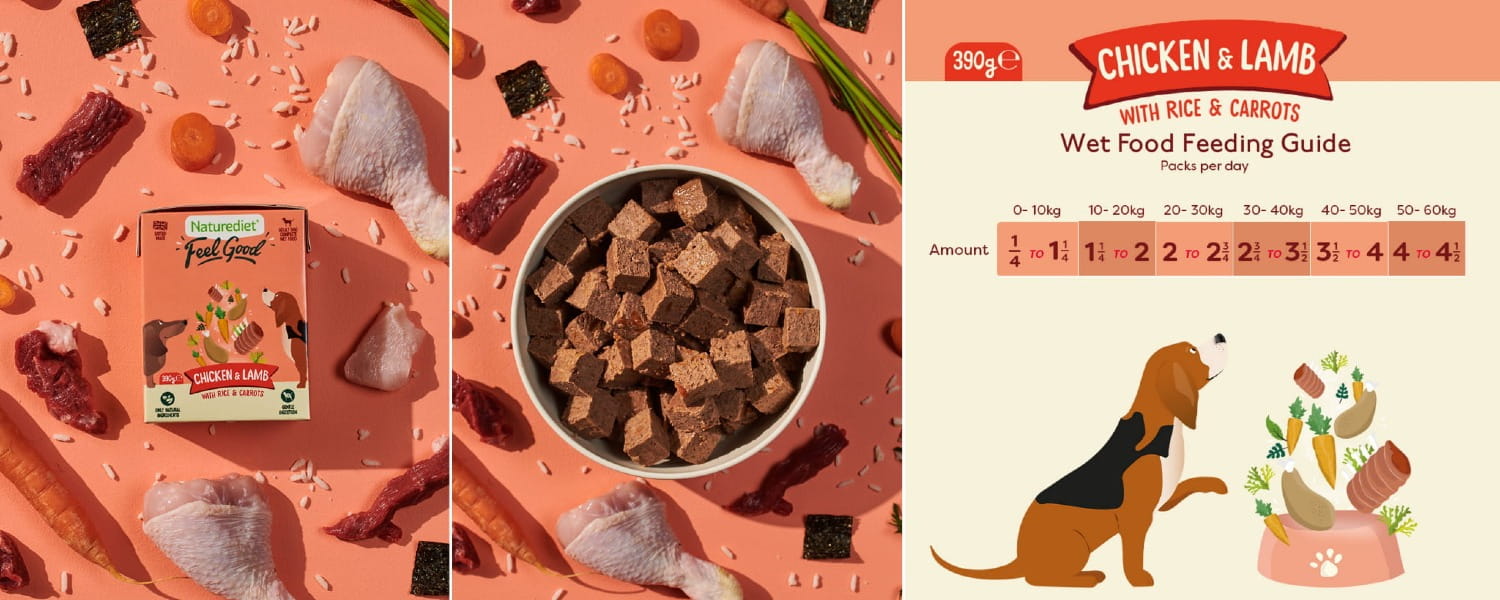 Naturediet Feel Good Chicken & Lamb to smakowita mokra karma, delikatnie gotowana na parze. Świeżo przygotowany kurczak i jagnięcina z dodatkiem ryżu oraz marchewki tworzy recepturę idealną dla psów dorosłych, starszych, a także szczeniąt powyżej 6. miesiąca życia. To pełnoporcjowy, zbilansowany posiłek stworzony wyłącznie z naturalnych, starannie dobranych składników odżywczych, które wspierają zdrowie, kondycję oraz wygląd Twojego pupila.