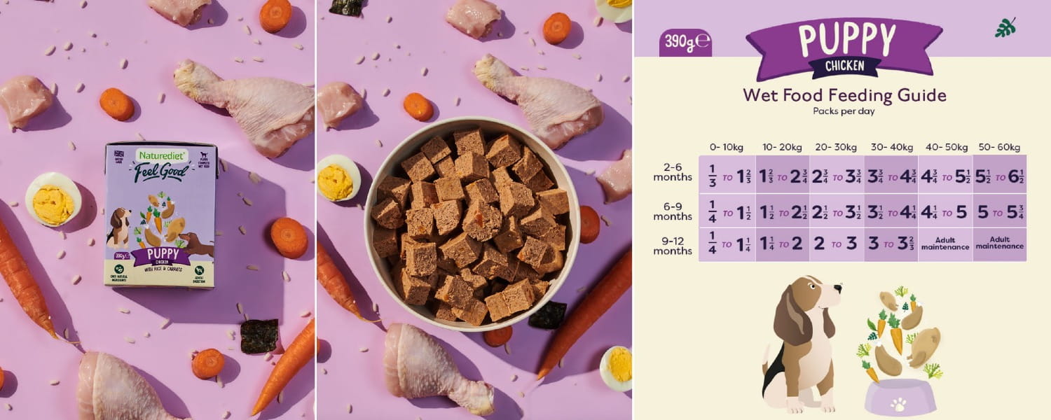 Naturediet Feel Good Puppy to smakowita mokra karma delikatnie gotowana na parze. Receptura opiera się na świeżo przygotowanym kurczaku z dodatkiem marchewki i ryżu. Przeznaczona dla szczeniąt od 4. tygodnia do 12. miesiąca życia, a także odpowiednia dla suk w okresie laktacji. To pełnoporcjowy, zbilansowany posiłek stworzony wyłącznie z naturalnych, starannie dobranych składników odżywczych, które wspierają zdrowy wzrost i prawidłowy rozwój młodego psa. Dodatek suszonego jajka podnosi poziom białka, zapewniając jeszcze lepsze wsparcie dla rozwijającego się organizmu. Karma świetnie sprawdza się u szczeniąt wybrednych oraz tych z wrażliwym układem pokarmowym — jest lekka, odżywcza i łagodna dla żołądka. Receptura jest prosta i zdrowa, bazująca w 100% na naturalnych składnikach.