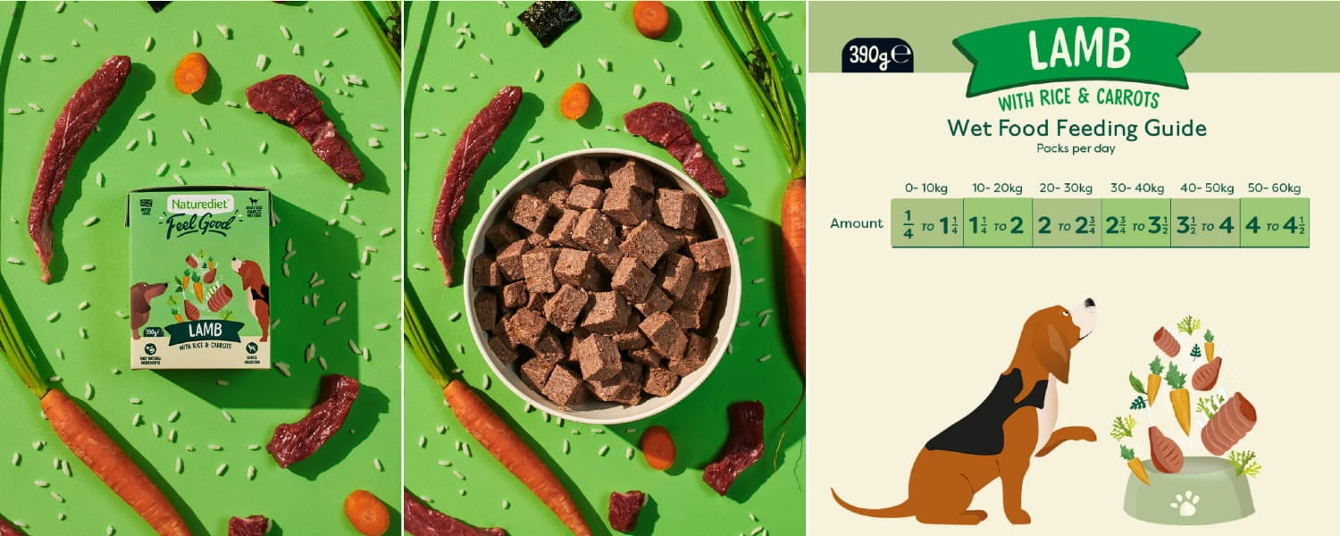 Naturediet Feel Good Lamb to smakowita mokra karma, delikatnie gotowana na parze. Świeżo przygotowana jagnięcina z dodatkiem ryżu oraz marchewki tworzy recepturę idealną dla psów dorosłych i starszych, a także szczeniąt powyżej 6. miesiąca życia. To pełnoporcjowy, zbilansowany posiłek stworzony wyłącznie z naturalnych, starannie dobranych składników odżywczych, które wspierają zdrowie, kondycję oraz wygląd Twojego pupila. Formuła jest mono proteinowa — jedynym źródłem białka zwierzęcego jest jagnięcina, co ułatwia żywienie psów wrażliwych i z alergiami pokarmowymi. Składniki są delikatnie gotowane na parze, dzięki czemu gotowy produkt zachowuje więcej witamin i minerałów. Do produkcji wykorzystuje się mięso odpowiednie również do spożycia przez ludzi.