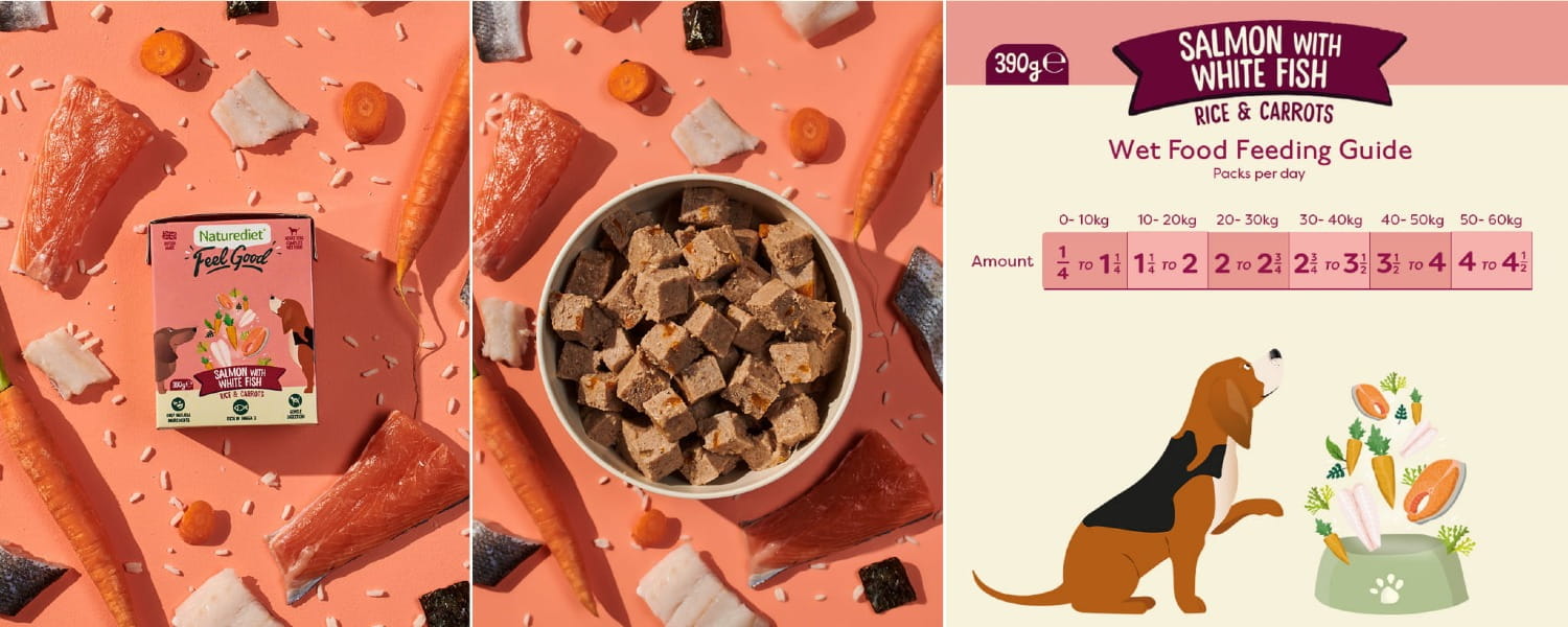 Naturediet Feel Good Salmon to smakowita mokra karma, delikatnie gotowana na parze. Świeżo przygotowany łosoś i biała ryba (ze zrównoważonych połowów) z dodatkiem ryżu oraz marchewki tworzy recepturę idealną dla psów dorosłych, starszych, a także szczeniąt powyżej 6. miesiąca życia. To pełnoporcjowy, zbilansowany posiłek stworzony wyłącznie z naturalnych, starannie dobranych składników odżywczych, które wspierają zdrowie, kondycję oraz wygląd Twojego pupila. Produkt zawiera dużą zawartość naturalnych kwasu Omega 3, który dba o sierść psa. Formuła jest odpowiednia dla czworonogów z wrażliwym układem trawiennym, problemami skórnymi oraz alergiami. Składniki karmy są delikatnie gotowane na parze, dzięki czemu gotowy produkt zachowuje więcej witamin i minerałów.