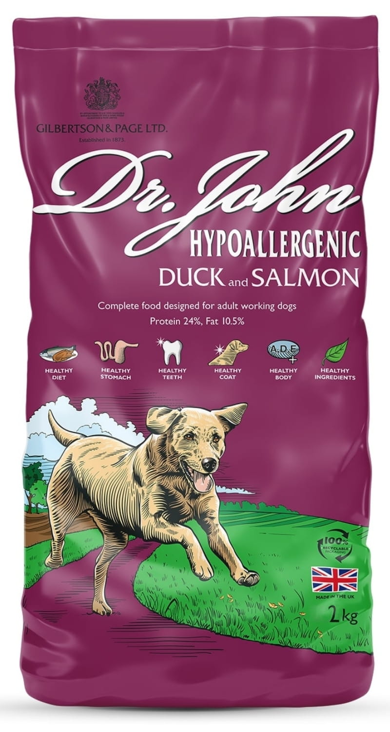 Karma Dr John Hypoallergenic Duck and Salmon została opracowana z myślą o psach z wrażliwym układem trawiennym lub tych, które mają alergię na kurczaka.