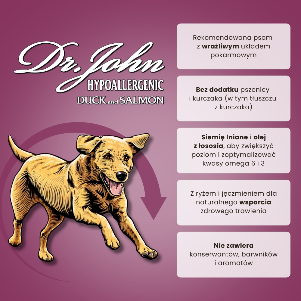 Dr John Hypoallergenic Duck and Salmon to hipoalergiczna sucha karma dla psów dorosłych bez dodatku pszenicy i kurczaka (w tym tłuszczu z kurczaka).